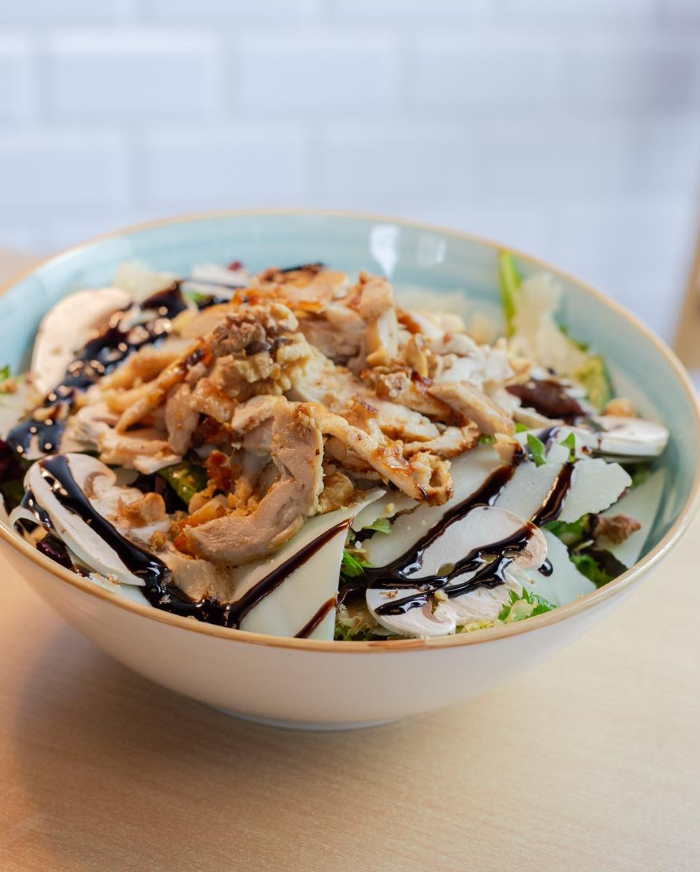 Mezclum, pollastre a la parrilla, champiñones, nueces, parmesano con reducción de balsámico.